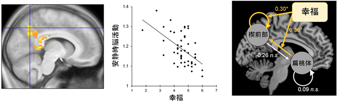 その結果、右楔前部の安静時活動が低いほど、主観的幸福得点が高いことが示された。つまり、より強く幸福を感じる人は、この領域の活動が低いことを意味する。先行研究から、楔前部の活動は、否定的な自己意識や、心の迷いや、執着する心に関係することが示されており、これらの心のはたらきが弱いことが幸福感の基盤となる可能性が考えられるという。また、右楔前部と右扁桃体の機能的結合が強いほど、主観的幸福得点が高いことも示された。扁桃体は感情処理に関わることから、感情を適切に統合することで幸福感が生まれる可能性が示唆された。