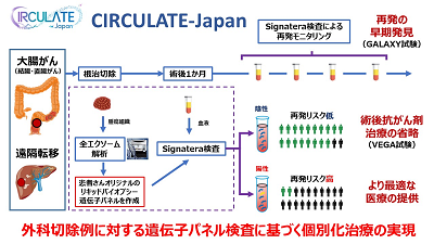 同センターは2015年2月に、産学連携全国がんゲノムスクリーニング事業「SCRUM-Japan」を立ち上げ、切除困難な固形がん患者を対象に、がん遺伝子異常を調べるプロジェクトに取り組んできた。現在、全国から200を超える医療機関と17社の製薬企業や診断薬企業が参画している。今回新たにSCRUM-Japanの基盤を活用し、国内外約150施設の協力を得て、外科治療が行われる大腸がん患者に対し、最適な医療を提供するための新しいプロジェクトとしてCIRCULATE-Japanを立ち上げた。