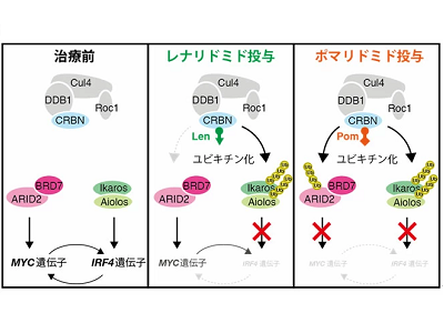 今回研究グループは、「ARID2」というタンパク質がポマリドミド特異的なネオ基質であることを明らかにした。ポマリドミドはレナリドミドよりもARID2を分解する活性が遥かに高く、レナリドミド耐性の多発性骨髄腫細胞においてもARID2を分解し、増殖阻害を引き起こした。これらの結果から、ポマリドミドはIkarosとAiolosに加えてARID2も分解に導くことでレナリドミドよりも優れた抗がん作用を発揮していることが示唆された。
