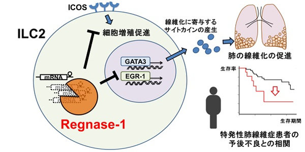 さらに、Regnase-1が転写因子のGATA Binding Protein3(GATA3)やEarly growth response protein1(EGR-1)の発現量を調節し、線維化促進機能を制御する可能性も示唆された。つまり、ILC2に発現するRegnase-1は、mRNAを分解することで、マウスにおいて肺線維症の発症を抑制することが明らかとなった。