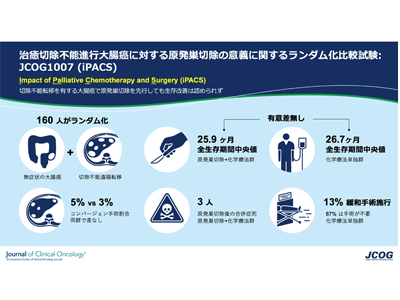 その結果、どちらの治療法を受けた患者も生存期間中央値は約26か月~27か月であり、原発巣切除を化学療法に先行しても生存期間が延長しないことが世界で初めて確認された。