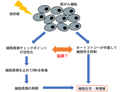 膵がん細胞の放射線抵抗性は、これらの細胞生存メカニズムがそれぞれ独立して働くことによるものと考えられており、細胞周期チェックポイントの働きを阻害すると放射線抵抗性が弱まることはわかっていたが、がん細胞におけるオートファジーの働きは複雑で良くわかっていなかった。研究グループは、この細胞周期チェックポイントとオートファジーが協調して働くことにより膵がん細胞が放射線抵抗性を示すのではないか、との仮説を立てた。そこで今回、放射線照射された膵がん細胞での細胞周期チェックポイントとオートファジーの関係を明らかにすることを目的として研究を行った。