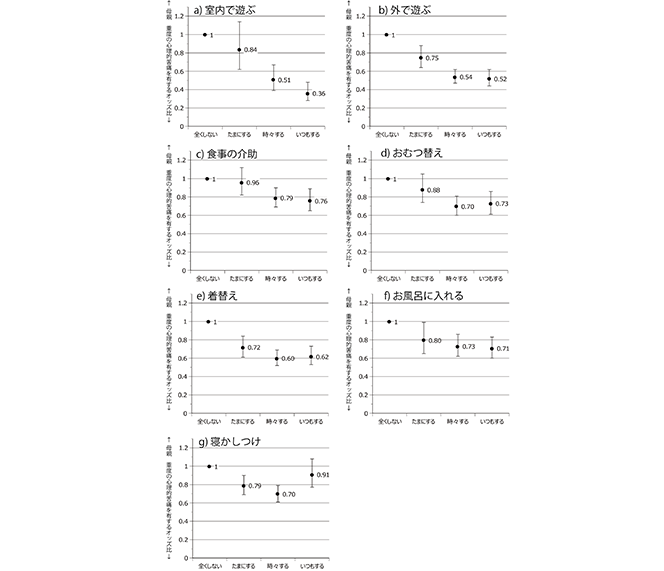 その結果、父親が育児行動を「全くしない」群と比べ、頻度の多い群では、母親が重度の心理的苦痛を有するリスクおよび、中等度の心理的苦痛であってもリスクが低くなる傾向が見られたという。