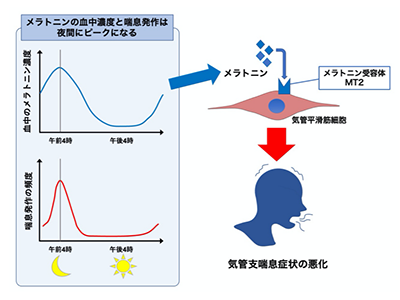 気管支喘息の患者は、しばしば夜間に症状の増悪を認める。しかし、その発症メカニズムは十分解明されておらず、既存の喘息治療薬も効きにくいと考えられている。概日リズム形成を担うホルモンであるメラトニンの血中濃度は午前4時頃に最大となるが、これは気管支喘息発作が頻発する時間帯と一致している。