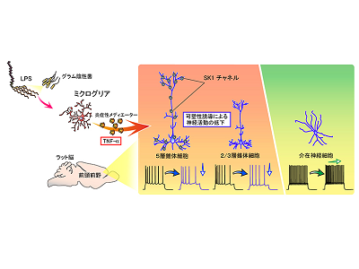 次に、5層錐体細胞で発火頻度が低下する詳細なメカニズムを明らかにするために、脳スライスへの薬剤の添加により発火頻度を観察した。すると、神経細胞応答に関与するCa2+活性化カリウムチャネルであるSK1チャネルが神経細胞膜上で機能を亢進させていることが示唆された。さらにそれは、ミクログリアによって分泌される炎症性物質であるTNF-αを介した、脱リン酸化酵素であるPP2Bの活性化によって起こることがわかった。