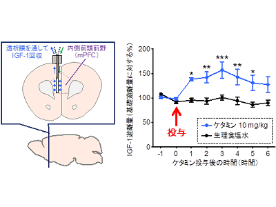 研究グループは、インスリン様成長因子-1(IGF-1)をmPFC内に局所投与すると、即効性の抗うつ作用が生じるという報告に着目し、mPFCに内在するIGF-1がケタミンの即効性抗うつ作用に関与しているのではないかと考えた。