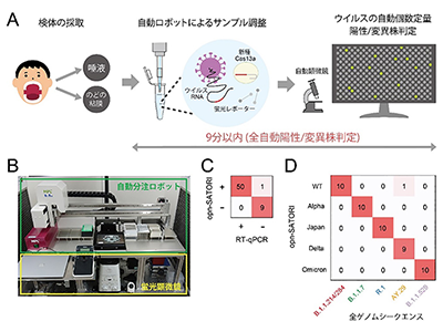 この背景も踏まえ、研究グループは2022年度に、世界最速の新型コロナウイルス(SARS-CoV-2)の全自動検出装置「opn-SATORI装置」を開発した。同装置はCRISPR-Cas13aと呼ばれる酵素と微小試験管を集積したマイクロチップを用いることで、SARS-CoV-2由来のウイルスRNAを「1分子」レベルで識別し、9分以内の世界最速の迅速検出を可能とする全自動装置だ。検出感度は1.4コピー/マイクロリットル(μL、1μLは100万分の1リットル、PCR検査法とほぼ同等)で、臨床検体を用いた検証実験では、陽性判定および変異株判定において98%以上の正解率を達成しており、従来技術と検出原理の異なる革新的な装置だった。