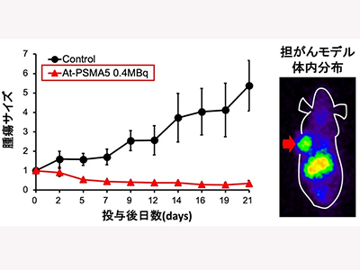今回の研究では、PSMAを標的とした新たな前立腺がんに対するアルファ線治療を目的として、複数のPSMAリガンドをアルファ線核種のアスタチン(At-211)で標識を行い、[At-211]PSMA5の開発に成功した。同放射性リガンドを前立腺がんのモデルマウスに単回静脈内投与を行ったところ、腫瘍に高集積を呈すると共に、腫瘍の退縮効果が長期間持続することが確認された。一方で、投与後のマウスに大きな体重の変動はなく、腎臓などのリスク臓器にも大きな副作用は認められなかった。