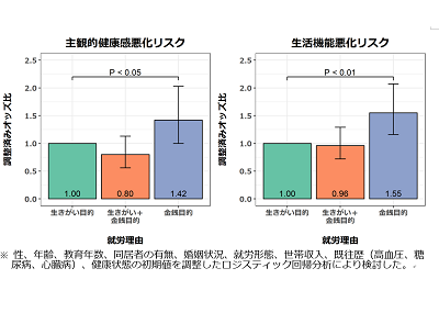 研究結果から、就労の動機が金銭のみである人において、就労による健康効果が得られていない可能性が示された。金銭のみを就労目的としている人は、より多くの収入を得るために、長時間・危険・重労働などによる身体的および精神的負担が大きいため、健康悪化リスクが高いと考えられる。一方、生きがいと金銭の両方を目的としている人は、必ずしも金銭が上位の就労動機ではないため就労によるストレスは小さく、生きがい目的の高齢就労者と健康悪化リスクが同等であることが示唆された。