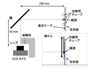 研究では、目に見えないγ線を可視化するため、プラスチック製の治療チューブからの発光(チェレンコフ光)に着目した。192Irγ線源によって照射された治療チューブからの発光を、CCDカメラを使用して撮影し、発光画像を得た。発光画像から線源の止まる位置を測定したところ、従来の測定法と同程度の空間分解能で測定できた。治療によっては金属製チューブを用いることもあるが、その場合、プラスチックテープを金属製チューブに貼って測定する方法により、線源位置の測定が可能であることがわかった。