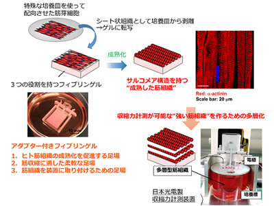 また、この多層型筋組織は定量的に計測できる十分に高い収縮力を生み出すことができるため、この手法は「強いヒト筋組織」を作り出す技術と言える。さらに当筋組織は、細胞と親和性が高く物理的に柔軟な素材でもあるフィブリンゲルを利用した手法を採用することで、収縮力計測装置(日本光電工業株式会社が開発)に適応できるように工夫されている。結果として、筋組織を電気刺激することで生じる筋収縮を計測することが可能になった。