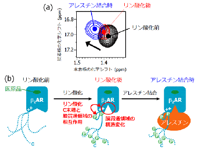 研究グループは、代表的なGPCRであるβ2アドレナリン受容体(β2AR)を核磁気共鳴(NMR)で解析。副作用発現の第一段階に対応するC末端領域のリン酸化を受けた状態、およびアレスチンが結合した状態における構造を調べたという。