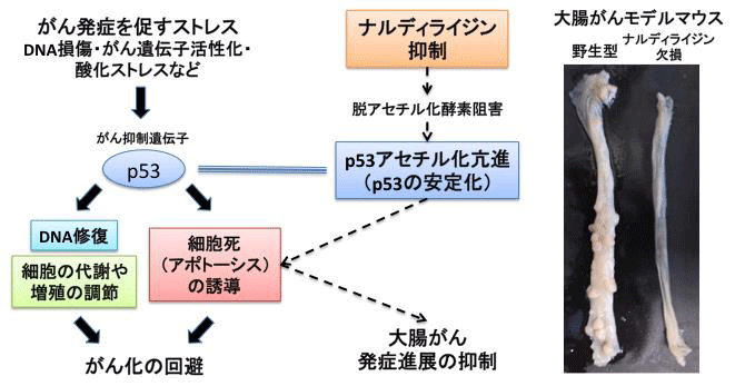 今回研究グループは、大腸がんモデルマウスを用いて、腸管上皮のナルディライジンを抑制すると大腸がんの進展が抑制され、逆にナルディライジンを増やすと大腸がん進展が促進されることを明らかにした。また、p53の発現はアセチル化という修飾によって安定化するが、その調節にHDACという脱アセチル化酵素が重要な役割を果たしていることもわかっている。大腸がんの細胞を用いて検討した結果、NRDCの発現を抑制するとHDACによる脱アセチル化が減少し、p53のアセチル化が亢進してその発現が安定化することが判明。これにより、p53発現が安定化し上昇することでアポトーシスが誘導され、大腸がんの発症・進展が抑制されることが示唆された。