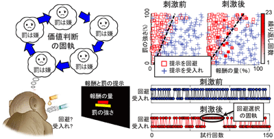 研究グループは、マカクザルに葛藤を伴う価値判断を必要とする課題を行い、尾状核を微小な電気で刺激して、局所神経回路の機能を調べた。その結果、ある部位を刺激することにより、サルが罰を過大評価することを突き止めたという。この悲観的な意思決定は、刺激実験終了後も長期にわたり持続することから、持続的な悲観状態が引き起こされることがわかったという。