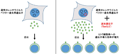研究グループは、レンチウイルスベクターを構成するためのプラスミドとともに、ヒトの内在性遺伝子産物のSPSB1あるいはヒトT細胞白血病ウイルスの転写促進因子Taxを発現するプラスミドを同時に産生細胞に導入することで、レンチウイルスベクター産生用遺伝子の転写を促進し、ウイルス粒子産生と標的細胞への遺伝子導入効率を飛躍的に増大させることに成功。とくにTaxを共発現させることで、レンチウイルスベクターによるヒトT細胞株への遺伝子導入効率が10倍を超えて増大したが、濃縮・精製したレンチウイルス粒子内へのTaxの取り込みは認められず、安全性が確保されていることもわかったという。