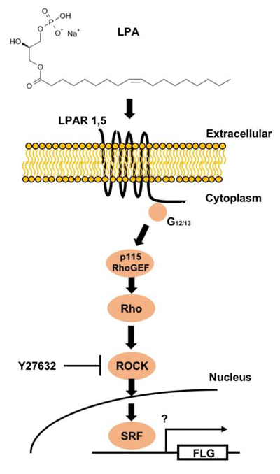研究グループは今回、ヒト表皮細胞でのフィラグリン発現の発現促進物質の同定と、その物質の働く分子メカニズムの解明を試みた。最初にヒト新生児皮膚から採取した表皮細胞を用いて、フィラグリン遺伝子発現誘導を安定的に定量できる実験条件を確立。さらに、GPCRアレイを用いた細胞内シグナル伝達に関与する受容体遺伝子発現の網羅的スクリーニングを行った結果、ヒト角化細胞に高発現するGタンパク共役型受容体(GPCR)を同定し、そのうちのひとつであるEDG2/LPAR1受容体のリガンドであるリゾホスファチジン酸(LPA)に濃度依存的なフィラグリン遺伝子発現誘導活性を見出した。また、各種LPA受容体の特異的アゴニスト・アンタゴニスト、さらにRNAiによる発現ノックダウンの手法を用いて、LPAR1とLPAR5の2種類の受容体がヒト表皮細胞におけるLPA依存性のフィラグリン発現誘導に不可欠であることを見出した。
