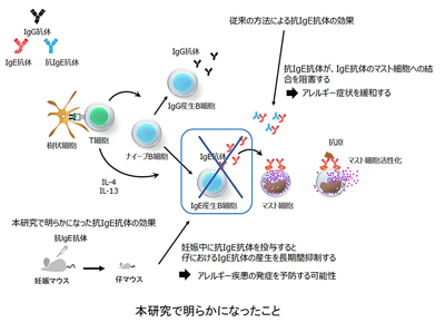 まず、妊娠中のマウスに妊娠中期および妊娠後期に1回ずつ、抗IgE抗体あるいはControl抗体を投与。生まれてきた仔マウスに対し卵抗原(OVA)をアジュバンドとともに投与・感作して、OVAに特異的なIgE抗体の産生能に対する効果を検討した。その結果、妊娠中のマウスに抗IgE抗体を投与すると、仔マウスのOVA特異的IgE抗体の産生を抑制することが判明。さらに、この抑制効果は、生後6週のマウスまで持続することがわかったという。その一方、OVA特異的IgG抗体の産生やOVA特異的なT細胞の反応には、影響を与えないことも明らかになったとしている。