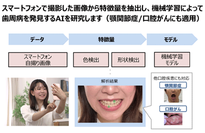 今回の共同研究では、スマートフォンで歯ぐきを撮影するだけで歯周病を発見できるAIを開発する。具体的には、撮影時の手振れや撮影環境の明るさの違いを考慮しながら、歯ぐきの色情報や歯周病独特の形状などを解析し、歯周病のリスクがあるかどうかを判定。この技術を用いることで、利用者は自宅や会社で空き時間に歯周病のリスクを把握し、歯科医師とのコミュニケーションを活性化させるという。これにより、歯周病検診の受診につなげることで重症化を防ぐことが期待される。