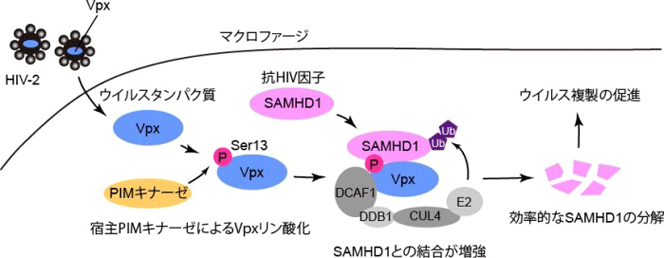 ヒト細胞が作り出す酵素の一種であるSAMHD1タンパク質は、マクロファージやCD4陽性T細胞へのHIV感染を強く阻止する。一方、ウイルス側、特に西アフリカに感染者の多いHIV-2は、ウイルス粒子内にVpxタンパク質をもっており、その働きにより細胞内でSAMHD1を分解する。これにより、HIV-2は骨髄系細胞やT細胞に感染することができる。研究グループは、新しい抗HIV薬の開発を目指す過程で、このVpxタンパク質の機能を抑制することに着目。まず、VpxのSAMHD1に対する働きを制御する因子の探索を行った。