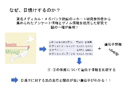 肌の色は、その色合いや日焼けのしやすさからいくつかのスキンタイプに分けられる。日本人のスキンタイプは日焼けのしやすさから、白肌で赤くなるが黒くならない1型、中間の2型、褐色から色黒肌で赤くならずに黒くなる3型の3タイプに分けられる。今回の研究では、東北メディカル・メガバンク計画の地域住民コホート調査参加者約1万人(宮城県、岩手県在住)を対象として、アンケート情報にある日焼けのしやすさについての質問項目からスキンタイプ情報に対してゲノムワイド関連解析(GWAS)を行った。