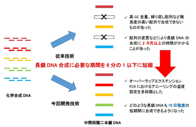 同技術を用いると、従来は困難だったGC含量が70%を超える配列や、繰り返し配列などを含む場合であっても、正確に効率よく中間段階2本鎖DNAを合成できるようになり、この結果化学合成DNAから長鎖DNAの合成に要していた時間を、従来の2か月以上から、10日程度に短縮することが可能になったという。