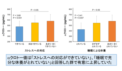 研究では、基礎疾患のない非喫煙者を対象とし、身体計測、血液検査、問診による生活習慣調査、心理的ストレスの程度を表わす指標として利用されているK6質問票を用いて、血清αクロトー値との関連について解析を行った。「ストレスへの対応ができていない」「睡眠で十分な休養がとれていない」と回答した群で血清αクロトー値が有意に上昇していたことから、精神的ストレスや睡眠状態が血清αクロトー値に影響を及ぼしている可能性が考えられた。さらに血清αクロトー値は、精神的ストレスや睡眠状態との関係性についてK6スコアと同様の傾向を示していた。これらの結果から、血清αクロトー値の上昇はストレス状態を予見している可能性があることが示唆された。