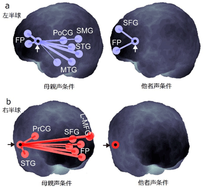 その結果、母親声条件では多くの脳部位で強い反応が見られ、他者声条件と直接比較すると、より強い脳活動が左下前頭回(言語野)など他4部位で見られた。さらに、これらの脳部位において、声を聞かせた直後に活性化する脳機能結合を解析したところ、母親声条件でより多く、強い脳機能結合が見られた。例えば、言語野である左下前頭回からは側頭部の縁上回(SMG)、上側頭回(STG)など、後部言語野と呼ばれる領域に多くの結合が見られる一方で、他者声の場合には前頭部内の短い結合しか見られない。この前頭-側頭部結合は、成人で見られる言語回路に相当し、新生児でも胎児期によく聞いていた音声を聞くと言語回路が活性化されることが示唆される。右上側頭回からは母親声条件で前頭部の多くの部位への結合が見られるのに対し、他者声では結合は全く見られない。右上側頭回は声の認識に関わる脳部位であり、新生児は母親声を認識した上で、前頭部につながることにより、愛着や感情など別の認知処理を行っていることが示唆される。