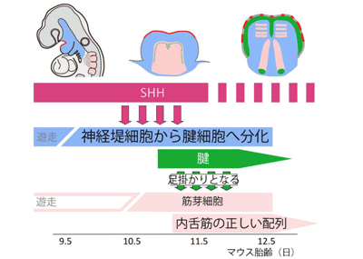 まず、舌発生期にShhシグナル伝達を減少、ないし欠失させた種々の遺伝子組換えマウスで、発生中および発生完了時の舌の形態を組織学的に観察。最初に、舌発生初期にあたる胎齢11.0日からShhシグナル伝達が減少するマウスで検討した。結果、このマウスでは、下顎や舌原基(将来の舌の原型となる器官)の大きさに大きな影響はなかったが、舌の中の筋(内舌筋)の配置が乱れ、腱も未発達だった。次に、遺伝子組換えと薬剤投与の組み合わせで胎齢10.5、11.5もしくは12.5日からShhシグナル伝達を欠失させたマウスで検討。結果、10.5日から欠失させた胚では、下顎と舌の両方が著しく小さくなり、11.5日からの欠失では下顎の大きさはほぼ正常だったが、舌は10.5日のときほどではないものの小さい傾向を示した。また、内舌筋の配置が乱れ、腱も未発達だった。12.5日からの欠失では、下顎や舌にはほぼ影響がなかった。つまり、マウス胎齢10.5日のShhシグナル伝達は主に下顎と舌原基の成長に、11.5日では主に内舌筋の配置と腱の形成に必要であること、Shhシグナルがこれらの発生事象に必要な期間は12.5日までであることが明らかになった。
