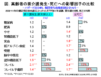 その結果、要介護発生のハザード比は、フレイル、フレイル予備群、認知機能低下、脳卒中既往で1.4~2.1倍と有意に高値を示した。一方、要介護発生の集団寄与危険度割合(その因子を取り除くことにより集団全体の要介護発生が何割減少するのかを表す指標)は、フレイル予備群が17%、フレイルが12%と、他の因子に比べ断然高率であった。死亡についても同様であり、フレイル予備群が24%、フレイルが13%の寄与危険度割合を示した。これらの結果は、フレイルおよびフレイル予備群に陥ることを防ぐことにより、約8年後までの要介護発生を約3割、死亡を約4割、それぞれ減らすことが可能となることが示唆するものだ。さらに、年齢別に解析した結果から、前期高齢期の方が後期高齢期よりも要介護発生や死亡に対するフレイルの影響度が大きいことが明らかになった。