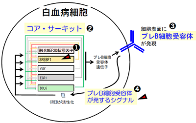 その結果、融合型MEF2D転写因子は、SREBF1などの他の転写因子と共同して、コア・サーキットを形成。このコア・サーキットは、プレB細胞受容体の発現を誘導するが、プレB細胞受容体が発するシグナルは、コア・サーキットの維持に必要である、というメカニズムが明らかになった。これは、コア・サーキット→プレB細胞受容体発現→プレB細胞受容体が発するシグナル→コア・サーキットという「いつまでも活性化し続ける回路」が形成されることを意味する。つまり、白血病の性質を決めるコア・サーキットの遺伝子が安定的に発現し、プレB細胞シグナルにより白血病細胞の増殖が刺激され続けることが、白血病の状態を維持していると考えられる。