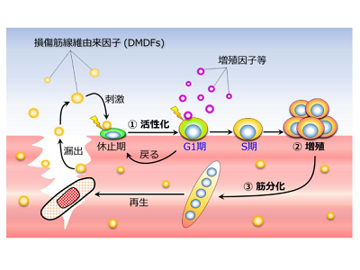 損傷筋線維から漏出する成分によりサテライト細胞を活性化、G1期に移行