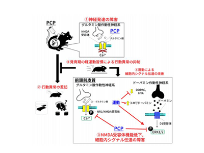 今回の研究成果により、発育期の低強度運動トレーニングによって統合失調症様の行動異常の発症が抑制されること、そのメカニズムの一端として、前頭前皮質のシグナル伝達能の正常化が関与する可能性が示唆された。
