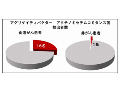 その結果、食道がん患者では非がん患者と比較すると、歯周病の状態が有意に悪く、喫煙率や飲酒習慣が高いことが判明。歯茎の下の歯垢中には歯周病に関わる多くの細菌が有意に高く検出された。中でもアグリゲイティバクター アクチノミセテムコミタンス菌については、がん患者で16人検出されたのに対し、非がん患者で検出されたのは1人だった。