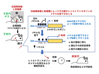 DNAのメチル化は、遺伝子のオン/オフを調節したり、ゲノム上に大量に存在する「動く遺伝子」のDNAをメチル化することによってその動きを抑制するなど、生命現象の維持に重要な役割を果たしている。これらのエピゲノムは環境因子曝露によって変化を受けることが知られており、環境因子による生殖細胞のエピゲノムの変化が次世代に伝わって多世代影響や継世代影響の原因となることが予想されている。しかし実際にはどのような分子がどのように影響を伝えるかなど現象の全体像が把握できておらず、将来の世代への影響評価は今後の課題となっていた。
