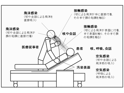 感染経路は飛沫>接触、患者のマスク着用と適正な換気が重要