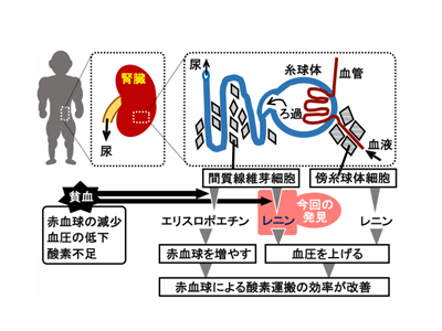 赤血球による酸素運搬は、腎臓のはたらきによって維持・管理されている。腎臓の間質線維芽細胞が赤血球を増やすために必要なホルモンであるエリスロポエチンを、傍糸球体細胞が血圧を上昇させる物質レニンをつくることが知られている。そのため、腎臓病では、血液中の老廃物を排泄するという腎臓の主たる機能が低下することに加え、貧血や血圧異常を引き起こすことがある。また、レニンが多いと高血圧になるが、レニンが過剰になる機序は解明されていなかった。