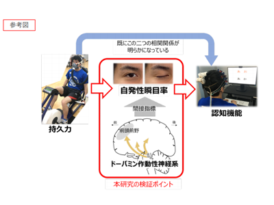 そこで今回の研究では、持久力、認知機能、ドーパミンの働きを反映し得る自発性瞬目率の3者の関係性を明らかにすることとした。