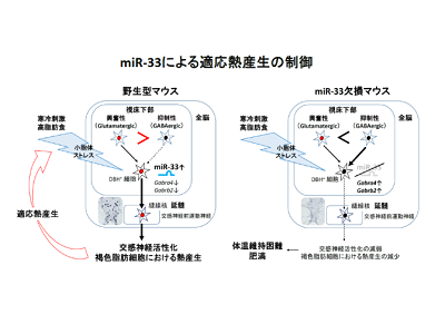 寒冷刺激により視床下部のmiR-33が増加することから、miR-33は視床下部において交感神経活性の程度を増強させるスイッチとして働き、熱産生を増加(適応熱産生)させていると考えられた。また、同様の機序は高脂肪食負荷でも起こり、熱産生を介して全身の代謝を調節していると推察された。