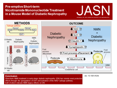 具体的には、8週令の糖尿病性腎症(Diabetic Nephropathy)を起こしたマウスにNMNを2週間短期投与し、その後中止しても、24週令の解析でアルブミン尿(Albuminuria)の抑止が継続していた。