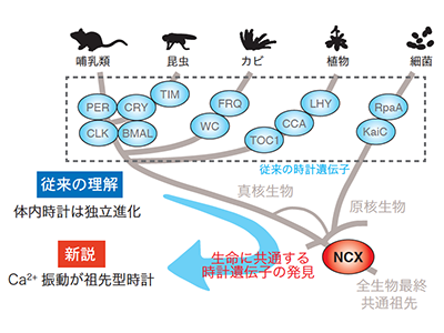 解析の結果、環境温度の低下に伴ってNCXが細胞内Ca2+流入を促進し、それによって活性化したCaMKIIが転写ループの振動速度の低下を防いでいることがわかった。つまり、本来は温度低下によって速度低下する転写ループは、低温で活性化するCa2+シグナルによって24時間の周期に保たれていたのである。この低温性Ca2+シグナルは哺乳類だけでなく昆虫、植物、細菌の概日時計でも機能していることが判明し、幅広い生命に保存された仕組みであることがわかった。NCXの機能が広い生物種の時計機能に保存されているという事実は、NCXがこれらの共通祖先の時計機能に関わっていたことを示唆する。つまり、時計遺伝子の転写ループは動物や植物、細菌が系統的に分岐した後に生まれた一方で、カルシウムによる概日時計の制御は共通祖先から機能していたと考えられるという。