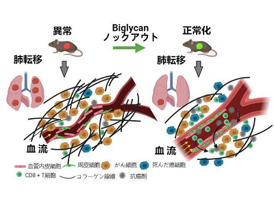 その結果、Biglycan発現が高い乳がん患者は、無増悪生存期間が短く、Biglycan発現は予後不良因子となることが示唆された。また、野生マウスに移植された乳がんに比べ、Biglycanノックアウトマウスの乳がんでは肺転移が減少。組織学的には腫瘍血管新生が抑制され、周皮細胞に被覆された血管数が増え、血管の正常化が起きていることがわかった。そのメカニズムとしてTNF-α/Ang2シグナル伝達抑制によることも判明した。さらに、がん組織の線維化が抑制され、CD8+T細胞浸潤数は増加し、抗がん剤の送達性も改善し治療効果が増強することがわかったという。