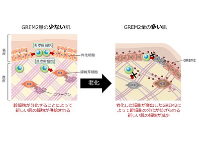 これらの結果からGREM2は、皮膚の幹細胞の分化を抑制することで、表皮ではターンオーバーを、真皮ではコラーゲンの産生を遅延させ、皮膚組織全体の老化を促進していると考えられた。