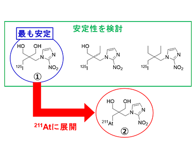 今回の研究では、2つの水酸基を有するネオペンチル構造を使用した211At標識法により生体内でも安定した211At結合分子を構築できることを実証した。今後、この211At標識法を応用することで、より有効で安全な核医学治療用薬剤の開発につながることが期待される。
