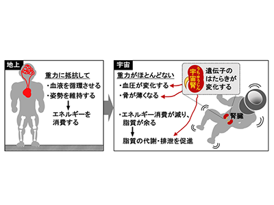 今回の研究成果により、宇宙では腎臓の遺伝子発現が変動し、血圧と骨量を変化させることが明らかにされた。また、微小重力環境では基礎的なエネルギー消費が低下するため、余った脂質を腎臓が処理することが判明した。