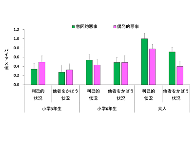 また、バイアスの強さは年齢によって違いがあることがわかった。小学3年生と6年生では4場面の間で差はなかったのに対して、大人では統計的に有意な差があり、利己的状況の方が他者をかばう状況よりもバイアスが大きく、また意図的悪事を隠す方が偶発的悪事を隠す場合よりバイアスが大きくなった。