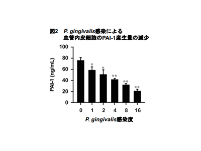 そこで、血管内皮細胞にP. gingivalisを感染させると、血管内皮細胞の創傷治癒は遅くなった。それに対して、加熱してジンジパインを失活させたP. gingivalisやジンジパイン欠損菌では、創傷治癒の速度は通常の血管内皮細胞と同じだった。血管内皮細胞に精製ジンジパインを添加すると創傷治癒は遅くなったことから、ジンジパインによるPAI-1の分解により血管内皮細胞の創傷治癒が妨げられることが示唆された。