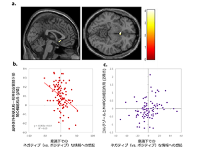 その結果、不安および抑うつ的な性格傾向のいずれも、自分でも明確な意識を伴わずにネガティブな刺激を思い出しやすいという偏った記憶処理と結びついていた。特に不安になりやすい性格傾向の人ほど、直前に接触した情報について、ポジティブと比べてネガティブなものをより多く取り込み、これを意識下でより多く思い出していたという。そして、扁桃体外側基底核-前帯状皮質膝下部との機能結合およびストレスホルモン・コルチゾールとMHPGとの相互作用は、このようにネガティブに偏った記憶の偏りを説明するものだとしている。