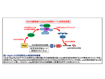 研究ではまず、Olig2と結合する分子の探索から始め、RNAヘリカーゼDdx20を同定した。Ddx20はRNAスプライシング、タンパク翻訳、転写などを制御する多機能な分子として知られている。発生期の中枢神経系でDdx20が欠損するマウスを作製し解析したところ、神経前駆細胞とオリゴデンドロサイト前駆細胞において、アポトーシス(apoptosis)と呼ばれる細胞死が急速に進むことが判明。細胞死の原因となるメカニズムを調べたところ、がん抑制遺伝子産物として知られるp53の過剰な蓄積が認められた。さらに、p53の蓄積はゲノムDNAが損傷することと、p53を分解する因子をコードするMdm2遺伝子のRNAスプライシングに異常が生じ、機能が喪失することが原因であることが判明した。