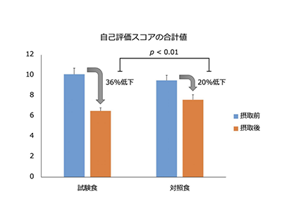 その結果、試験食群ではプラセボ群と比べ、自己評価スコアの合計値が有意に低下。アンケートの項目別では、1日のくしゃみの回数、1日に鼻をかんだ回数、涙目、そして頭重感の4項目は試験食群で有意なスコアの低下が認められたが、鼻詰まりと目のかゆみの2項目はスコアが低下していたものの、生物統計学的な有意差は認められなかった。