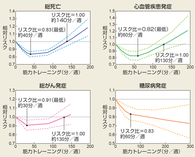 筋トレを全く実施していない群と比較して、筋トレを実施している群の総死亡および心血管疾患、がん、糖尿病のリスクは、ウォーキングやランニングなどの有酸素性の身体活動の影響を考慮しても、10〜17%低いことが明らかになった。